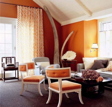 Kevin Isbell knew how to make this1930's center-hall colonial home current by injecting warm and intrinsic details such as geometric trims to floral curtains, gross-grain ribbon tape to a plain white sofa and visually connecting two separate rooms by custom painting grass cloth walls the same color as the ceiling. "Grass cloth has a warmth that paint does not, and darker colors are more cocoon-like" Kevin Isbell.